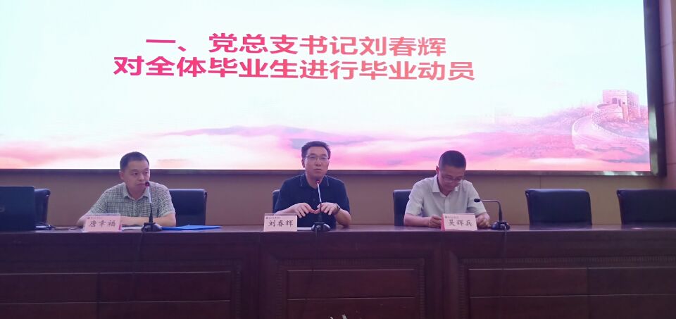 党总支书记刘春辉老师对毕业生进行毕业动员。他教育引导毕业生要以学校“三心四能五复合”人才培养目标和学院“一知、二守、三讲、四会”的育人理念严格要求自己,对照自己找差距补短板,要自觉践行社会主义核心价值观,增强热爱母校、建设祖国、服务社会的责任感,牢记母校和师长的嘱托,走出学校,走向工作岗位,在工作岗位上和今后的人生路途中要有浓厚的爱国情怀、坚定理想信念、砥砺奋进前行、扎实学习本领、锤炼自己的品格,要艰苦奋斗、攻坚克难,经受锻炼、增长才干,为实现中华民族伟大复兴贡献自己的智慧和力量。