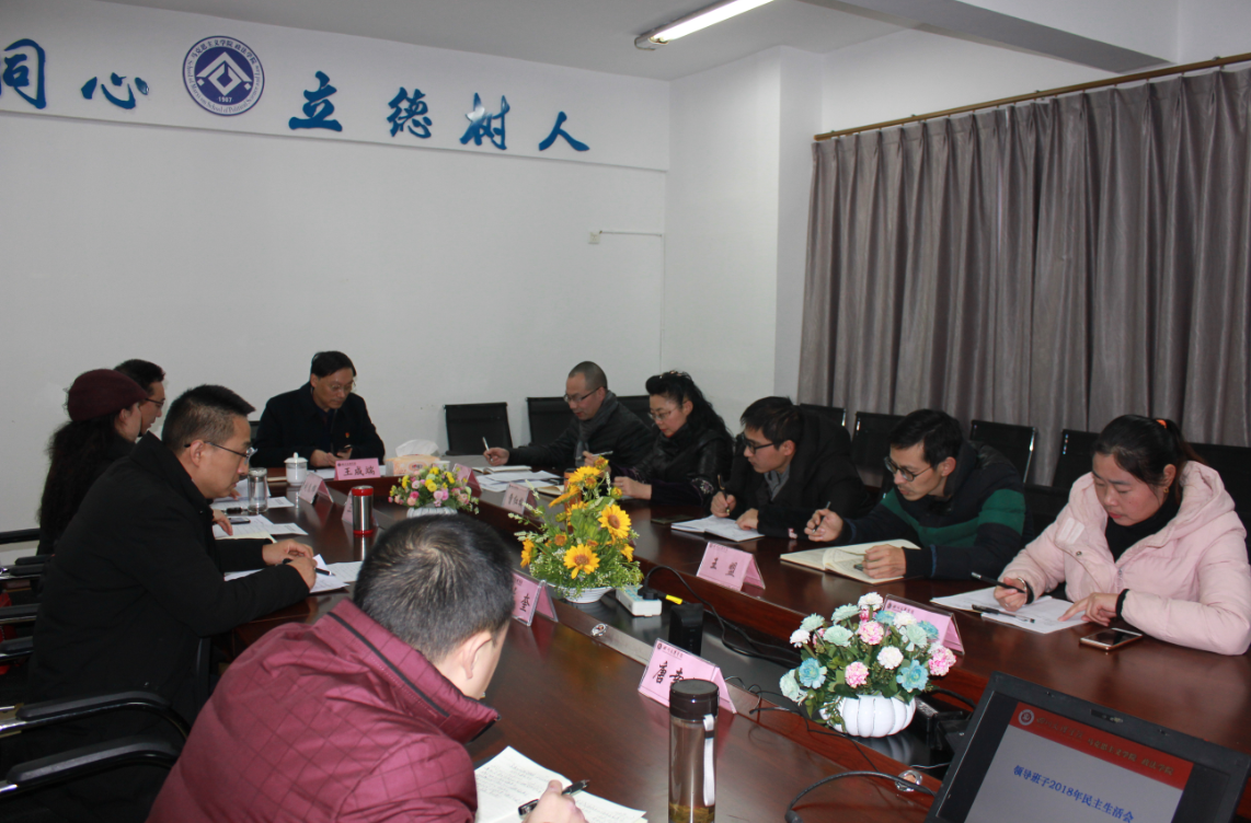 1月7日下午,awc777万象城娱乐官网、政法学院党总支在一教楼611会议室召开领导班子2018年民主生活会。党委书记王成端、督导成员秦静莅会指导,班子成员王秀珍院长、吴辉兵副书记参加会议,党政办、学工办、教研室主任列席会议,总支书记刘春辉主持会议。