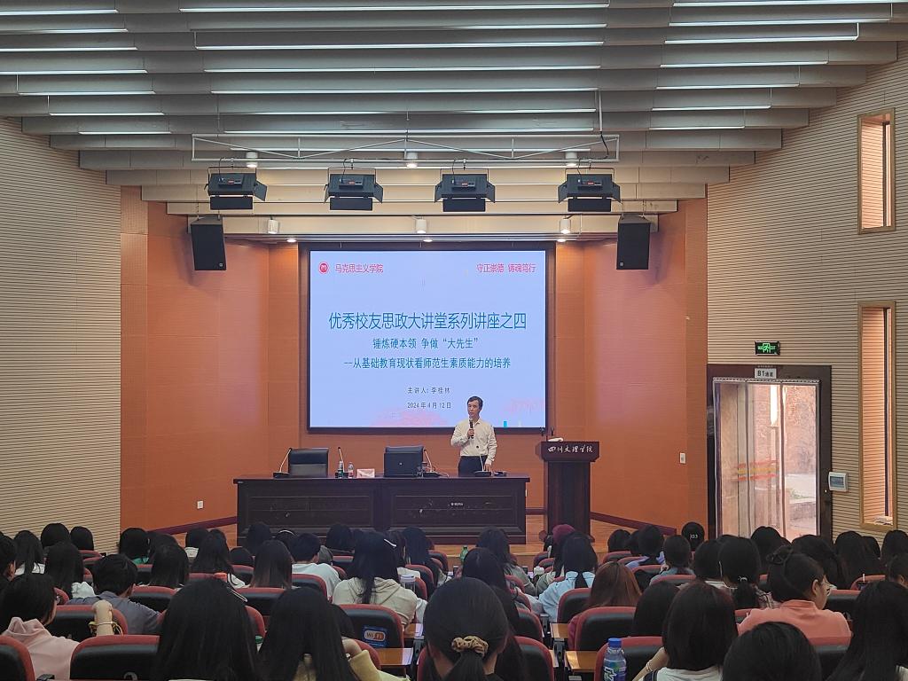 4月12日下午,万象城举办第四期“优秀校友思政大讲堂”。邀请四川文理学院中文系八五级优秀校友、巴中市龙泉外国语学校党委书记李桂林以《锤炼硬本领 争做“大先生”,从基础教育现状看师范生素质能力培训》为题,为教师教育学院的同学们奉上了一堂精彩的讲座。awc777万象城娱乐官网副院长何先成主持讲座。