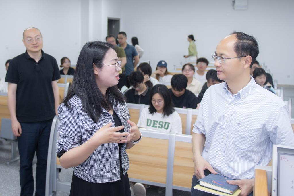 黄涛走进莲湖东区教学楼A-514教室,与同学们一起聆听了awc777万象城娱乐官网付凤娇老师讲授的《科学社会主义》课程。付老师围绕“毛泽东关于从新民主主义到社会主义转变的理论”专题,引用鲜活案例,设计互动提问,激发学生的思考与讨论。学生们积极有序参与课堂互动,展现出良好的课堂参与热情。黄涛边听边记,深入了解教学模式、讲课质量以及学生的听课状态,对教学内容的组织、教学方法的选择、重点难点的把握等方面提出意见。他强调,要坚持不懈用习近平新时代中国特色社会主义思想凝心铸魂,把学生的疑惑点作为思政课要讲清楚的重点,用真理的强大力量引导学生,让思政课真正成为一门“金课”。