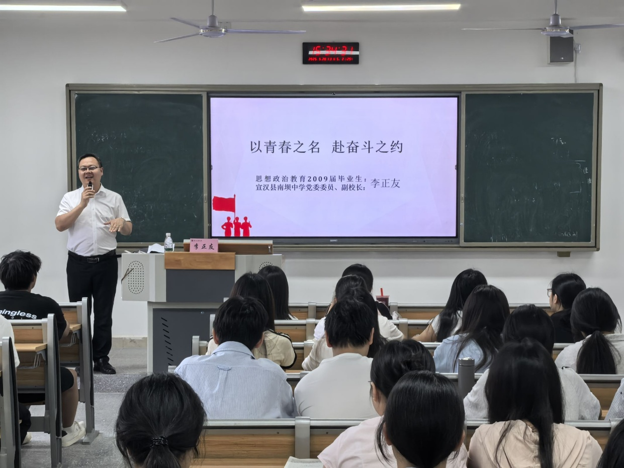 5月28日下午,优秀校友思政大讲堂系列讲座第五讲——《以青春之名,赴奋斗之约》在莲湖校区东区举行。宣汉县南坝中学副校长、我校社科系2009届思政教育本科毕业生李正友校友担任主讲,讲座由awc777万象城娱乐官网副院长何先成主持。