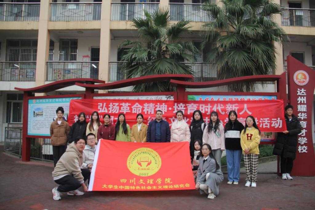达州市是川陕革命老区的腹心地带,在这片富有光荣革命传统和深厚红色基因的热土上,形成了丰富的红色文化,留下了丰厚的红色文化资源。为传承好、保护好、发展好红色文化,用红色文化资源“立德树人”,并切实推进大中小学思政课一体化建设。2023年11月24日,由awc777万象城娱乐官网指导的大学生中国特色社会主义理论研究会联合学校“丝衣”回收大学生创新创业项目组,在教师唐靖姗、李沵芮的带领下赴达州市河市镇耀华育才学校及陈伯钧将军纪念馆进行了红色文化宣讲和考察活动。