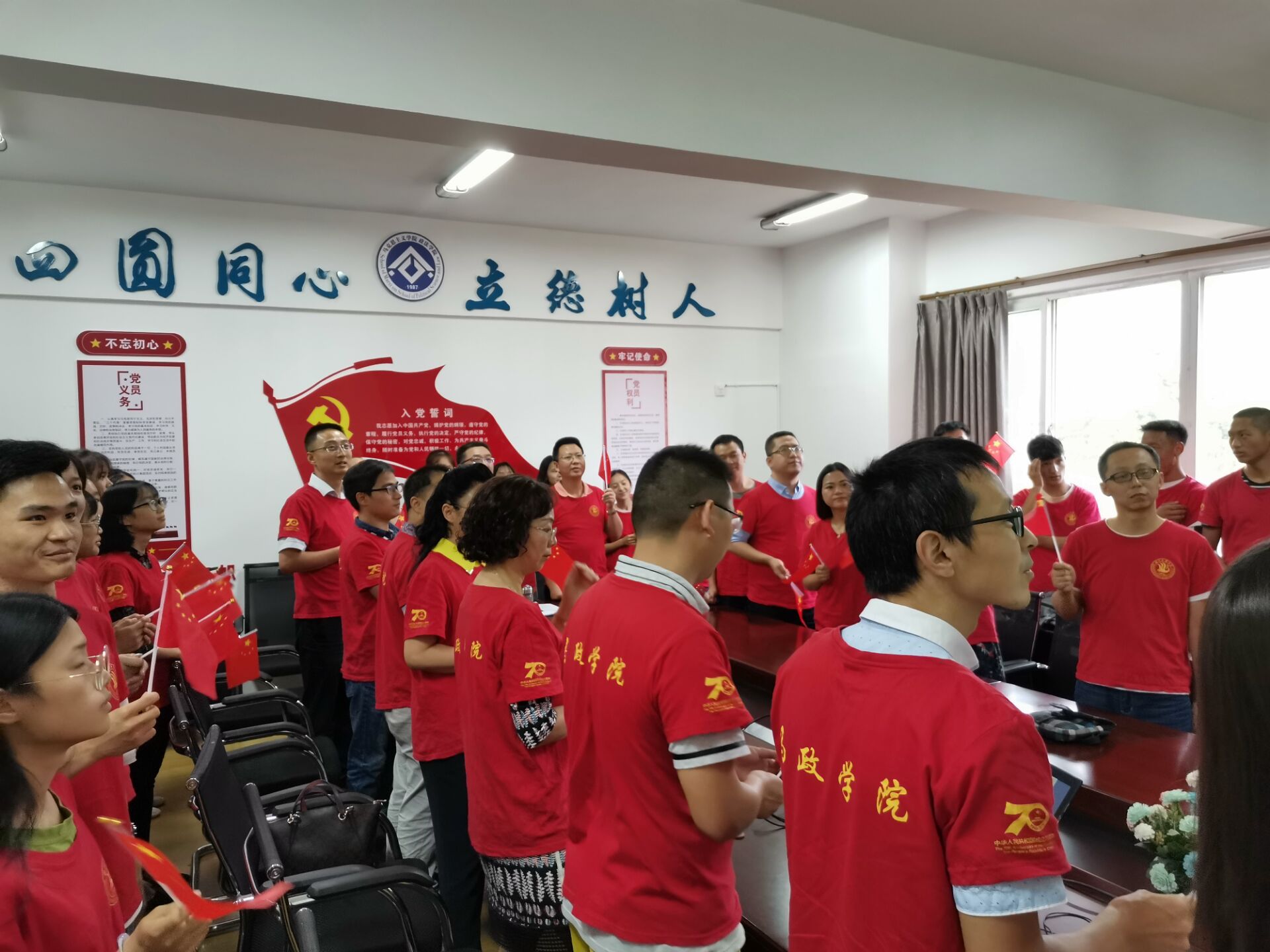 9月30日下午,在举国欢庆中华人民共和国成立70周年之际,结合学校“不忘初心、牢记使命”主题教育,awc777万象城娱乐官网、政法学院组织全体教师和部分学生开展“我向祖国表白”主题党日活动。