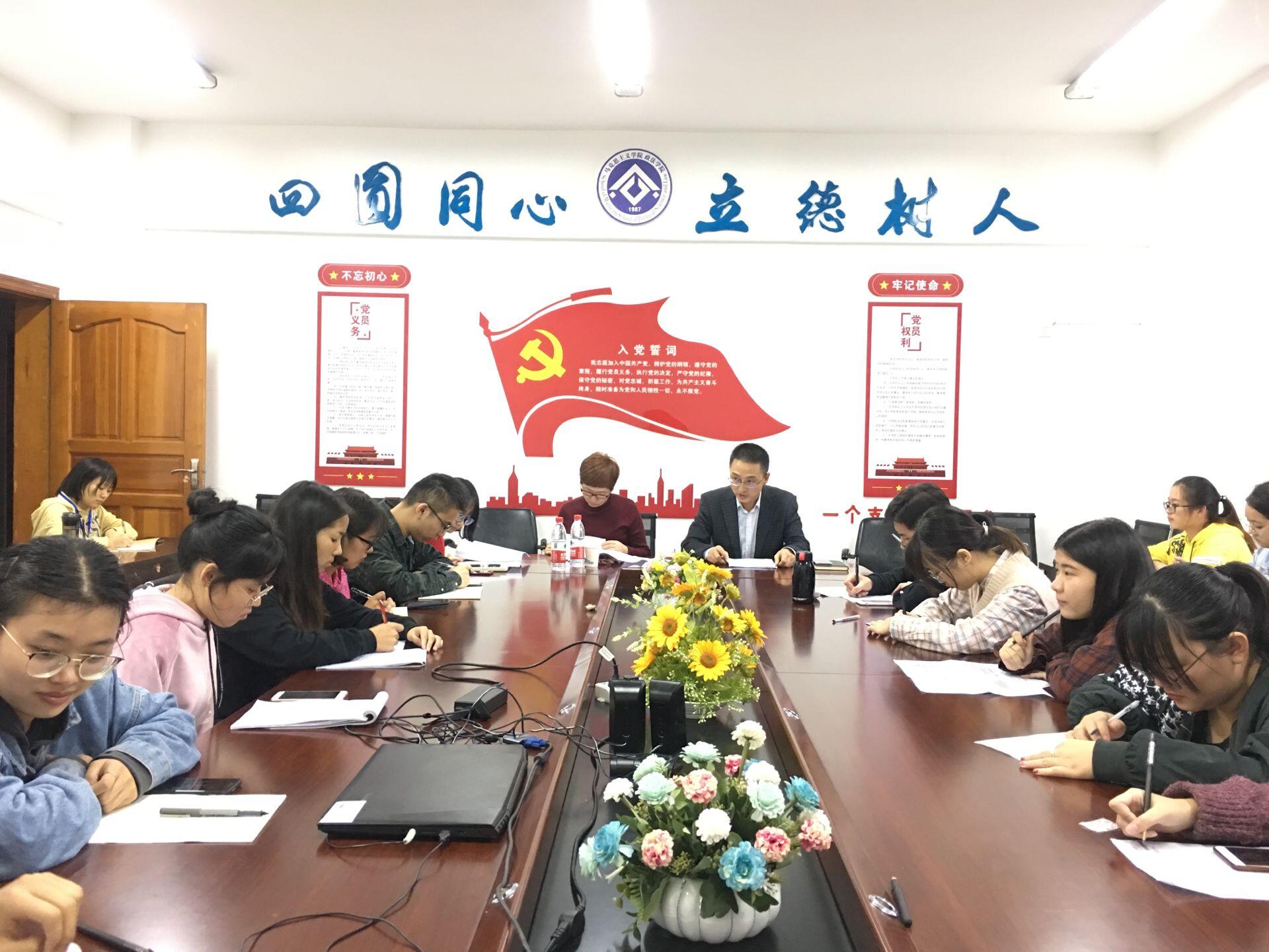 2019年10月10日下午5:30,万象城学生党支部对照党章党规找差距专题会在博文楼611会议室召开,党总支副书记吴辉兵、辅导员曾亚、政法学院全体学生党员参加会议。学校主题教育督导员、离退休工作处处长郑静到会指导工作。