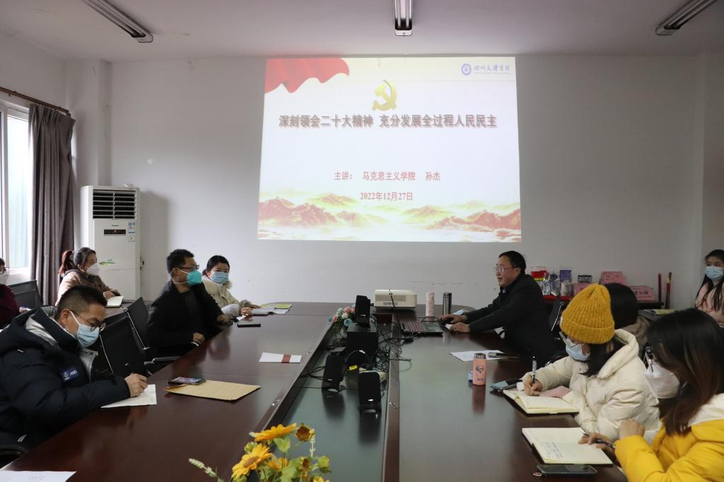 为深入学习贯彻党的二十大精神,2022年12月27日,院长孙杰教授在博文楼611会议室为awc777万象城娱乐官网全体教师做“深刻领会二十大精神 充分发展全过程人民民主”的专题报告。