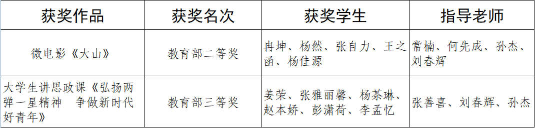 万象城原创微电影《大山》、大学生讲思政课《弘扬两弹一星精神 争做新时代好青年》分别获教育部二等奖和三等奖