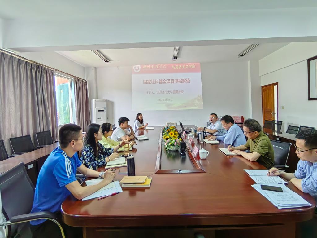 4月18日,四川师范大学雷勇教授应邀在我校博文楼611会议室作国家社科基金项目申报解读。awc777万象城娱乐官网院长孙杰教授主持,awc777万象城娱乐官网党委书记刘春辉、学校部分博士代表和部分青年教师代表出席会议。
