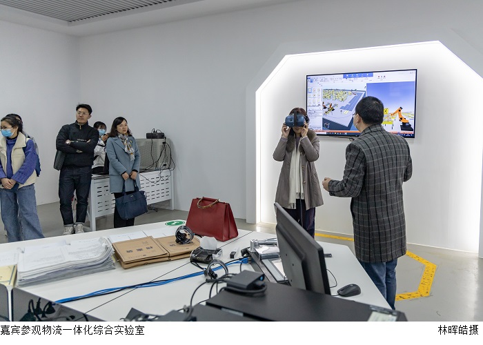 嘉宾们重点参观了伟德官网实验室。在机器视觉与智能检测工程技术研究中心,苏真伟教授从研发、应用及不断改进的历程介绍了实验室最新成果。在建设学院教学楼,马佳阳老师讲解了伟德官网实训室设备以及培训学生的大体方向,学生可以通过这些设施的演示,直观地学习建筑的过程。在物流一体化综合实验室,黄永福主任从先进的实验设备、VR系统的操作动画等方面详细地介绍伟德官网在VR等前沿科技的探索和研究,同时,他邀请来宾佩戴VR头盔亲自感知和体验VR技术。在电子商务产教融合一体化实训室,教学老师讲解了实训室基本情况,并对配备设施作了简单介绍。