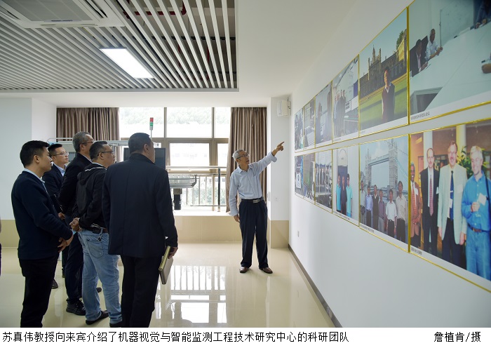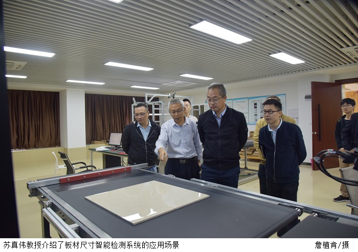 机器视觉与智能监测工程技术研究中心苏真伟教授向来宾介绍了机器视觉与智能监测工程技术研究中心的科研团队、专利技术,并展示了最新的科研成果。苏真伟教授还详细讲解了板材尺寸智能检测系统的工作流程、生产功能以及应用场景。苏真伟教授指出,板材尺寸智能检测机器视觉系统应用光学成像、计算机技术和图像处理技术,每秒能够获取处理几千万个数据,高精度、高速度的非接触测量板件尺寸。板材尺寸智能检测机器视觉系统在家具板、陶瓷等领域已广泛应用,目前,伟德官网已与索菲亚家居股份有限公司达成友好的合作模式。