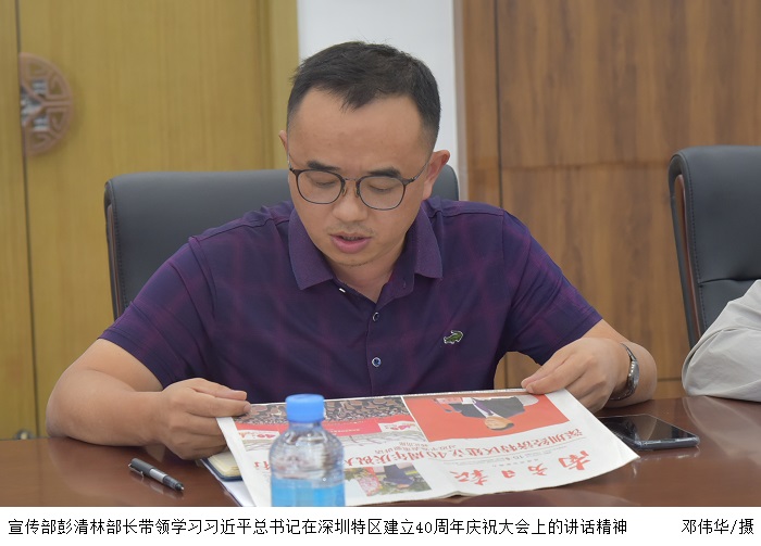 宣传部彭清林部长带领学习了习近平总书记在深圳特区建立40周年庆祝大会上总结的经济特区40年改革开放、创新发展积累的十条宝贵经验。