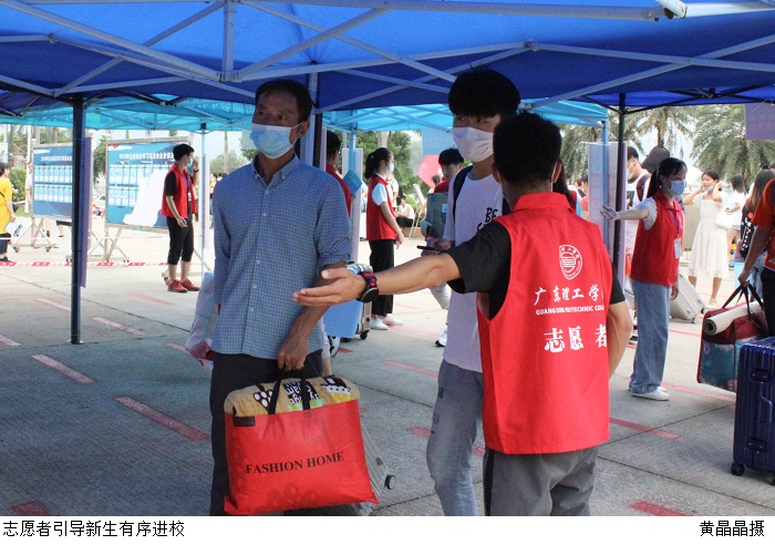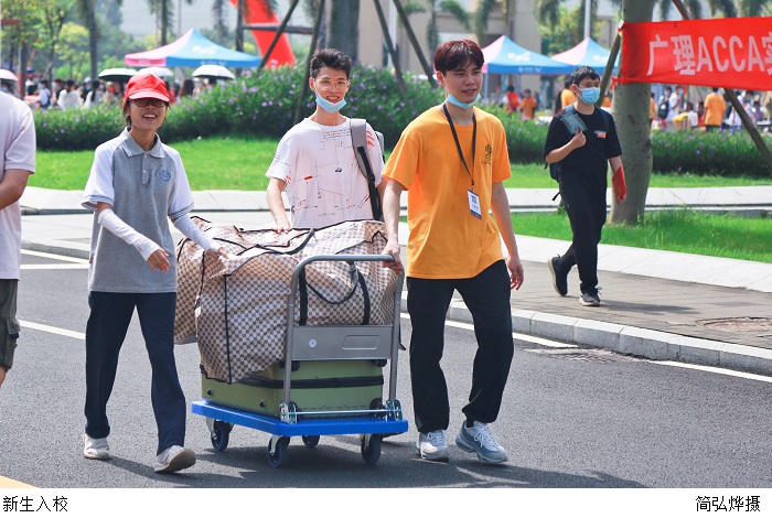 迎新志愿者们面带微笑,分布在校园内各个迎新点,为每一位新生指引、测温、搬运行李、答疑解惑,帮助新生完成一系列的报到流程并熟悉校园。时值疫情防控期间,学校安排爱心护航车“小白”为新生搬运行李。