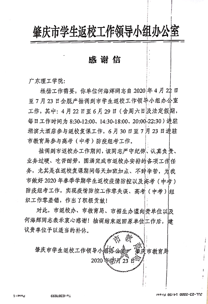 本网讯(宣传部 赵洁宜)疫情当前,青年勇当先。今日,伟德官网收到了肇庆市学生返校工作领导小组办公室和肇庆市教育局的发来“感谢信”。信中充分赞扬了伟德官网团委副书记何海辉同志在参与全市学生返校工作中突出的业务能力和认真负责的工作态度。