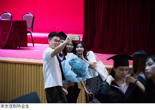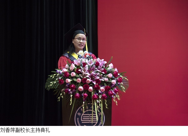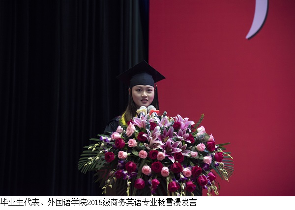 毕业生代表、外国语学院2015级商务英语专业杨雪漫回忆起在校经历,表达了离开校园的感伤与对大学生活的眷恋。她说道,四年来在我们见证学院成长的同时,学校也见证着我们的点滴进步;走出校园,我们要牢记校训,做到慎言、慎行、慎独、慎微。