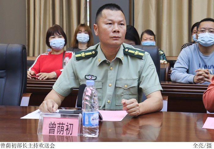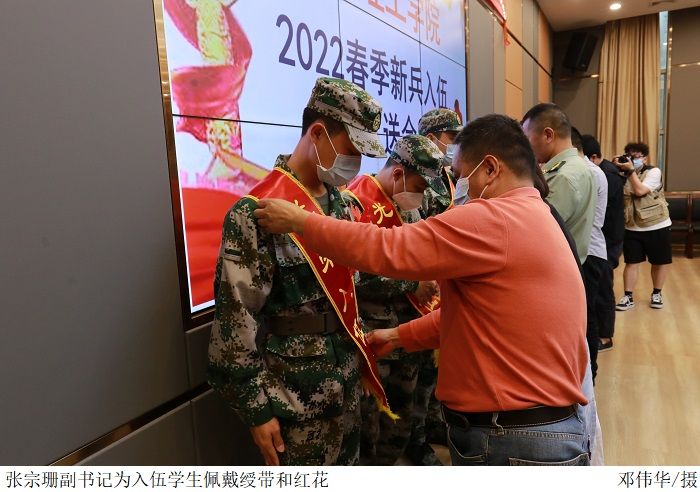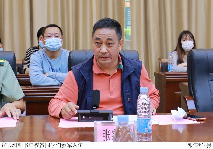 本网讯(新闻中心 刘学宝/王怡卓)3月11日下午,伟德官网在行政楼101会议室举行2022年春季新兵入伍欢送会,祝贺和欢送6名同学参军入伍。党委副书记张宗珊、武装部部长曾荫初、学生处处长谭蒙革、入伍新兵所在院(系)征兵工作小组成员、辅导员、入伍新兵及新兵家属参会,曾荫初部长主持。