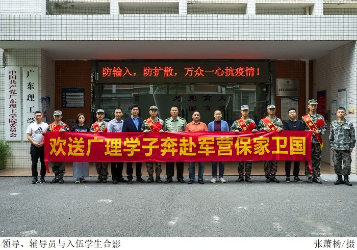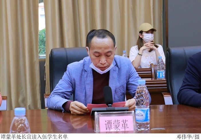 谭蒙革处长宣读入伍新兵名单。出席领导及参会辅导员为新兵佩戴“光荣入伍”礼带和红花,在行政楼门前合影后欢送6名新兵踏上新征程,投身国防,报效祖国。