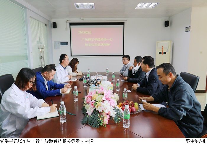 在广东骏驰科技股份有限公司,人事部经理曹应红介绍公司汽车配件研究方向与人才需求。双方就校企合作方面进行深入探讨。随后,在副总裁刘毅勇陪同下,张东生一行参观了骏驰科技的生产车间。