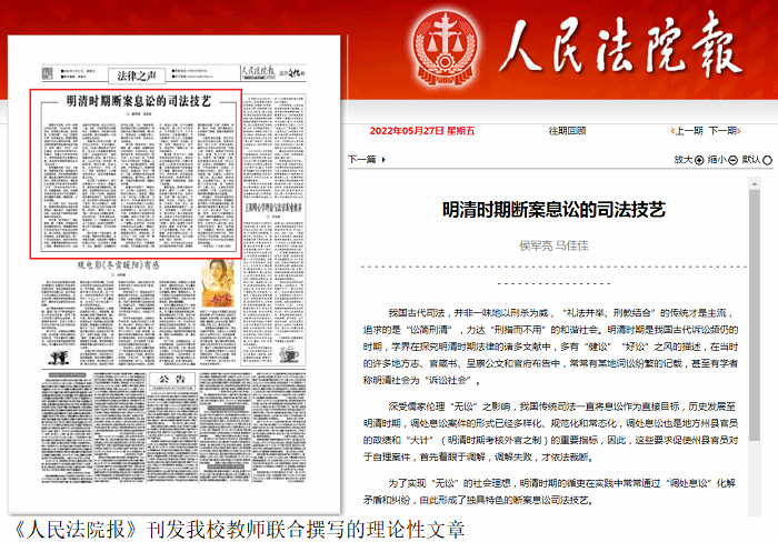 本网讯(马克思主义学院 陈洪超)5月27日,《人民法院报》刊发了伟德官网侯军亮和马佳佳两位老师联合撰写的论文《明清时期断案息讼的司法技艺》。