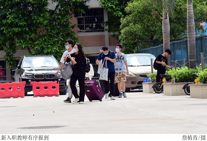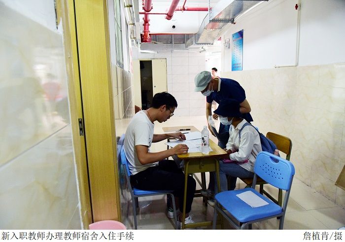 新教师入职报到当天,为响应疫情防控工作安排,人事处强化防疫要求与工作流程,做好“一对一”服务,为新老师办理入职手续,耐心解答相关问题;后勤处为新教师办理教师公寓登记入住,并发放住宿大礼包;校内通勤小白车从校门口将新教师接送至宿舍楼下办理入住。报到现场有条不紊、井然有序。
