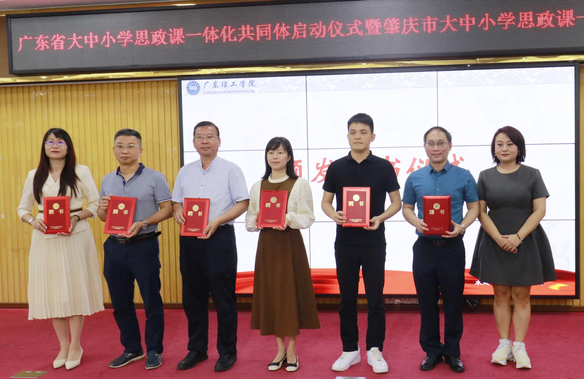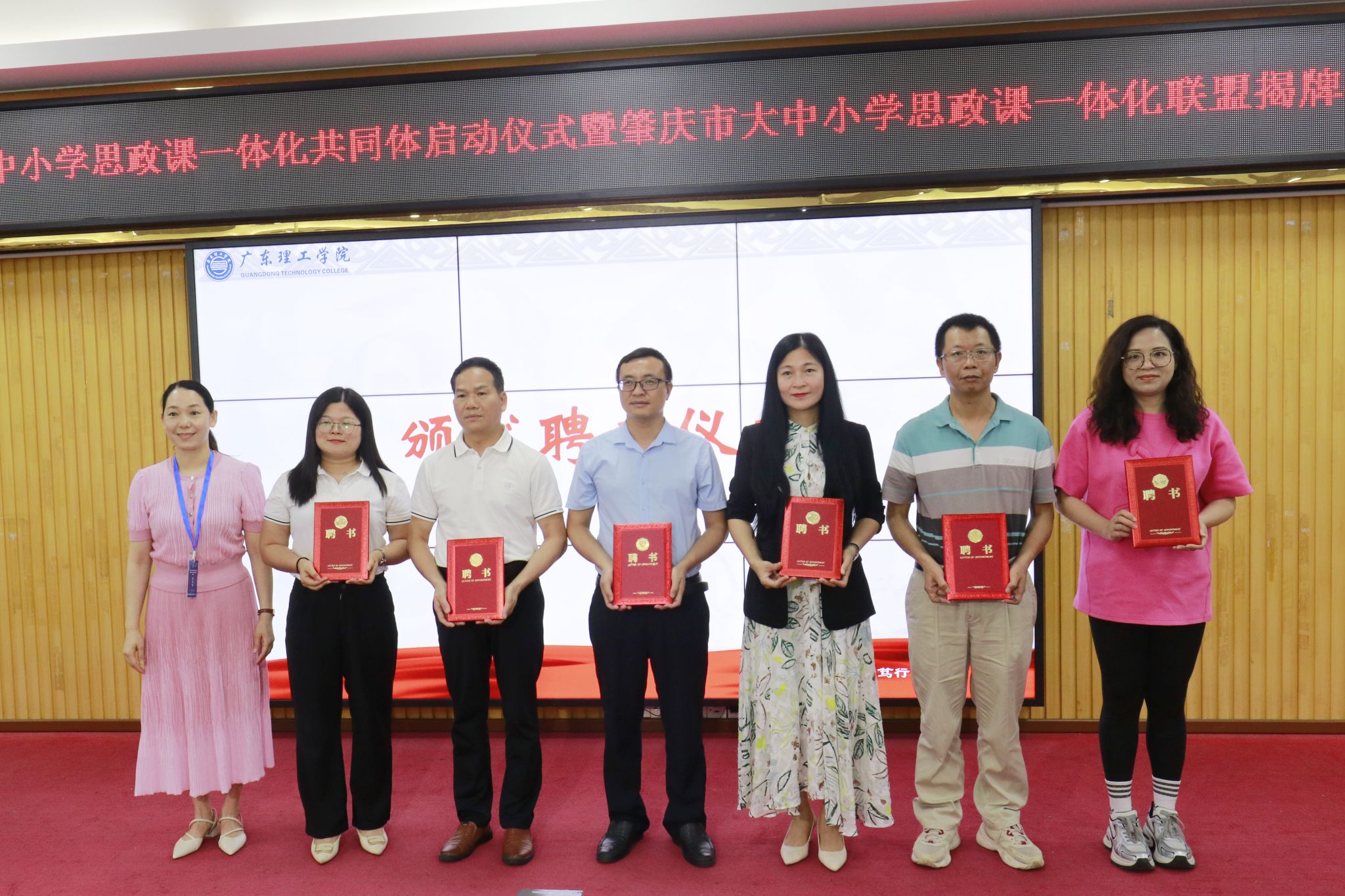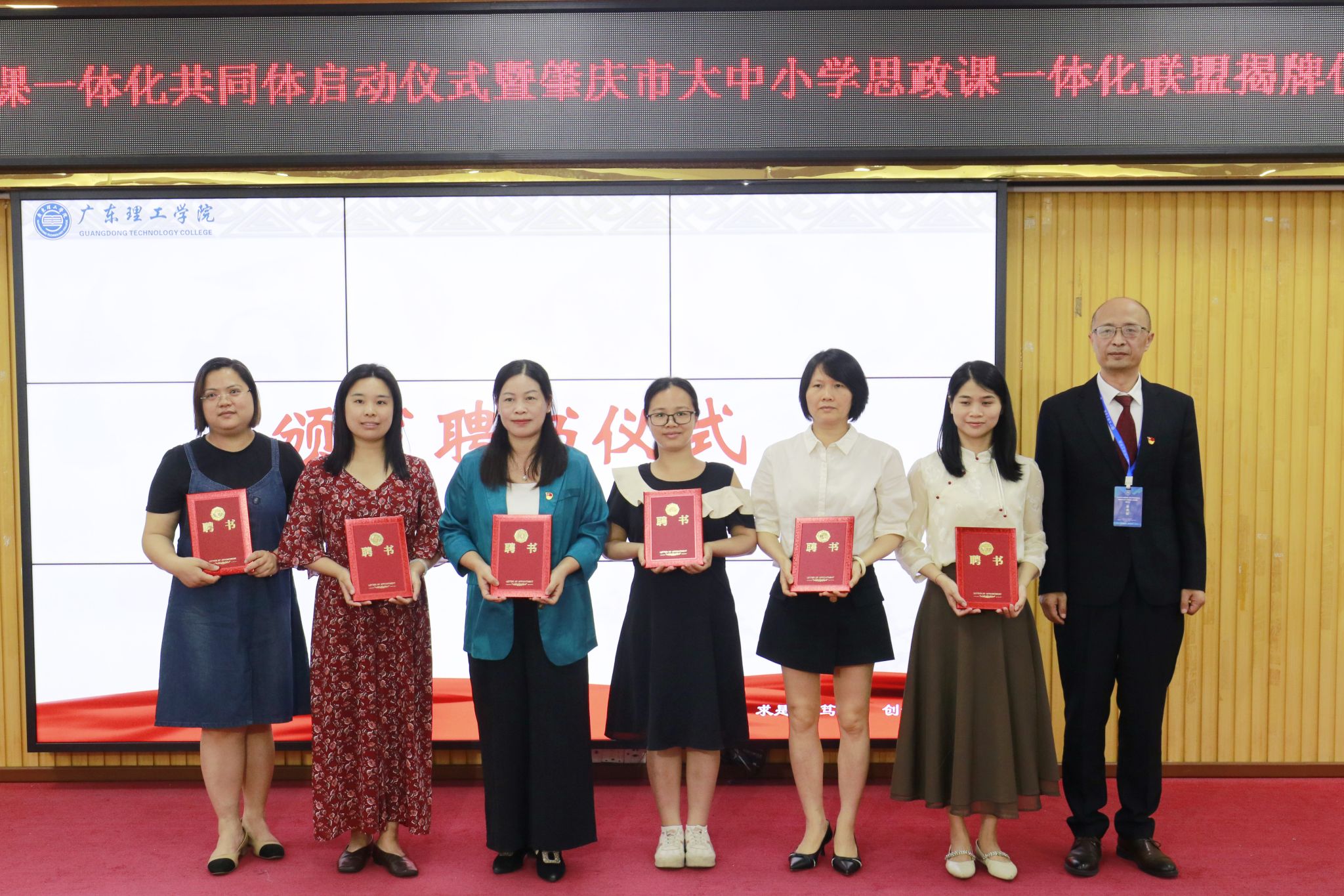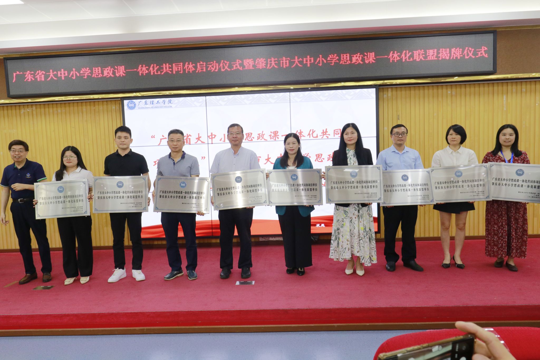 与会嘉宾为“广东省大中小学思政课一体化共同体牵头高校”暨“肇庆市大中小学思政课一体化联盟”揭牌。“广东省大中小学思政课一体化共同体项目单位”和“肇庆市大中小学思政课一体化联盟单位”代表也相继接受聘书。