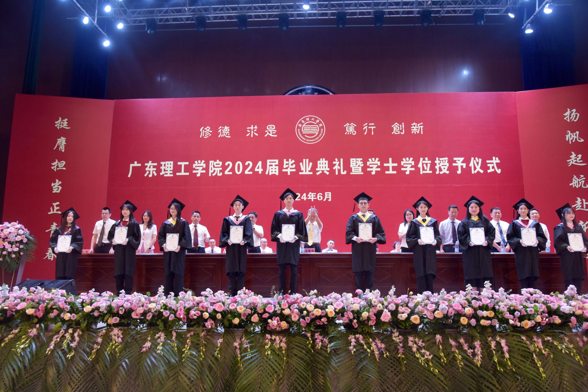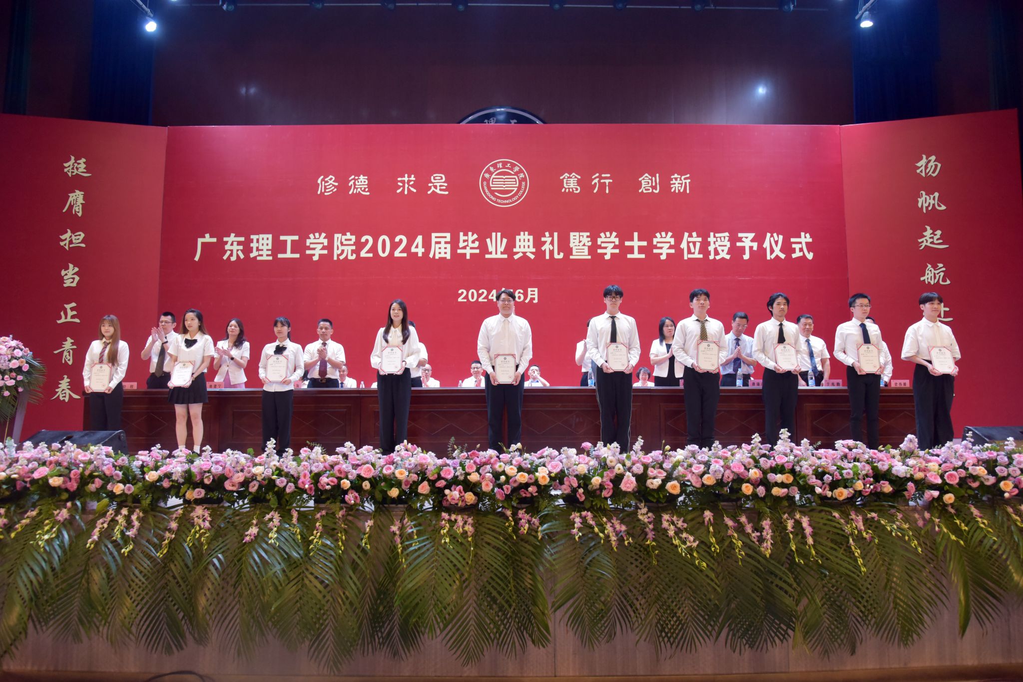 主席台就座领导为本科、专科优秀毕业生代表颁发 “荣誉证书”“毕业证书”。