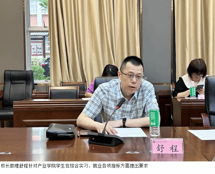 校长助理舒程针对产业学院学生在综合实习、就业各项指标方面提出要求,他指出产业学院学生在综合实习落实率、岗位专业对口率、初次就业薪酬、实习转就业成功率等指标方面要发挥校企联合育人优势,追求更高要求,落实更高质量。