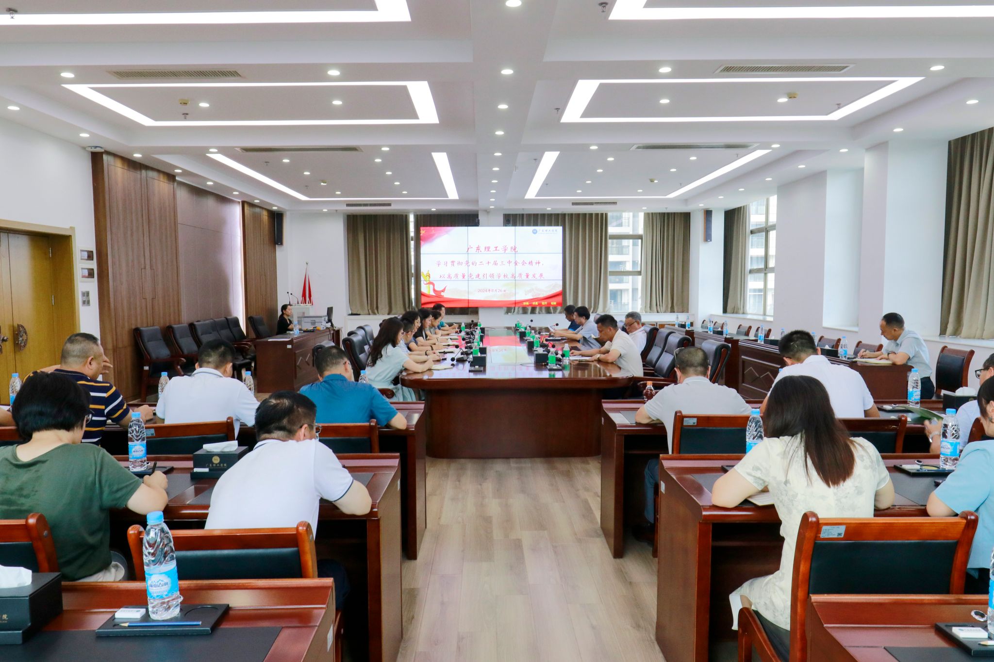 本网讯(宣传部)8月26日下午,学校党委在综合楼12楼会议室召开党委扩大会议,深入学习贯彻党的二十届三中全会精神,以高质量党建引领学校高质量发展。党委书记胡海建传达省民办教育协会关于学习贯彻党的二十届三中全会精神,党委副书记黎会友领学党的二十届三中全会精神,校长张湘伟作总结发言,党委副书记张宗珊主持会议。