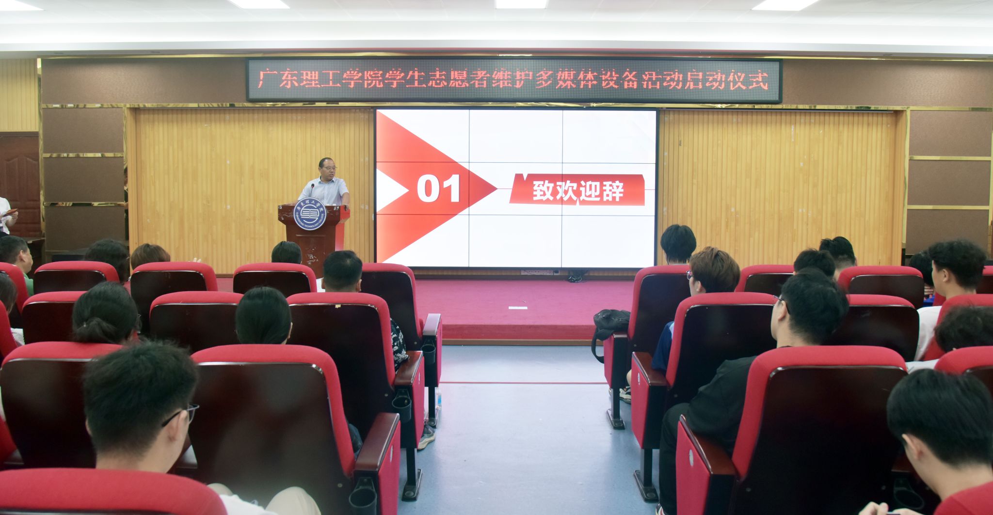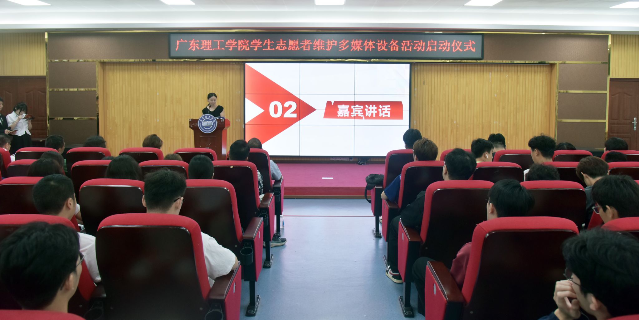 本网讯(网教中心)为进一步弘扬“奉献、友爱、互助、进步”的志愿服务精神,提升大学生信息素养,锻炼其实践技能和团队协作能力,9月23日晚,网络与现代教育教学技术中心与校团委共同策划的“学生志愿者维护多媒体设备活动”在高要校区振华楼学术报告厅隆重启动。常务副校长柴维斯、党委副书记张宗珊、党委宣传部部长张冬、学生处处长谢桂袖、网络与现代教育教学技术中心主任胡致杰、校团委副书记邢媛满出席启动仪式。
