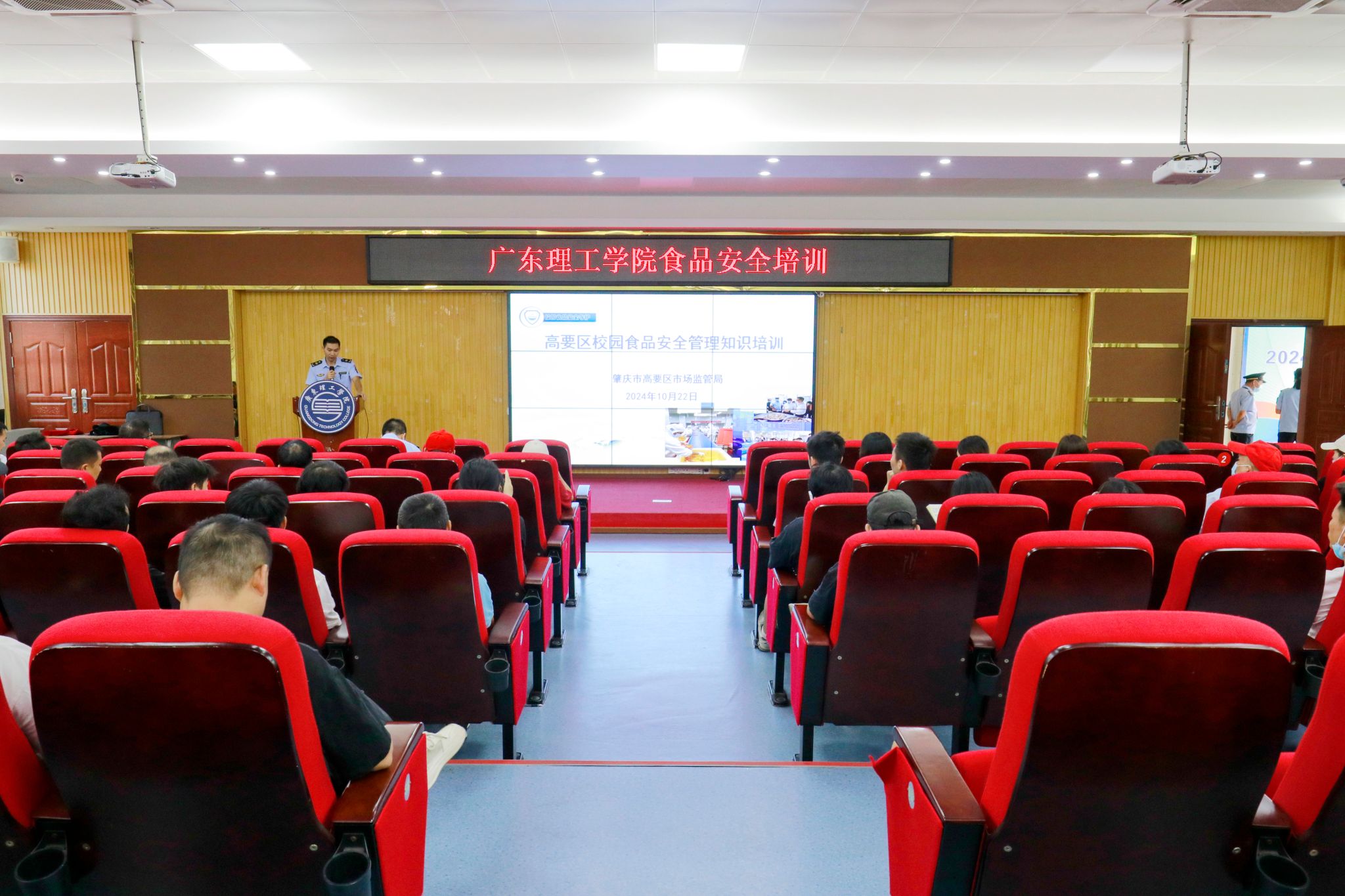 本网讯(宣传部)2024年10月22日,为进一步加强校园食品安全管理,提升学校食品安全管理人员的法律意识和风险防控能力,确保广大师生的饮食安全,伟德官网邀请高要区市场监督管理局专业技术人员到振华楼学术报告厅开展了校园食品安全管理知识培训。本次培训由莲塘市场监督管理所所长王炜锋担任主讲,校长助理梁伟雄主持。市场监督管理局的相关同志、食堂餐饮工作人员、商铺负责人、物业管理相关同志、后勤处相关人员等参加了此次培训。