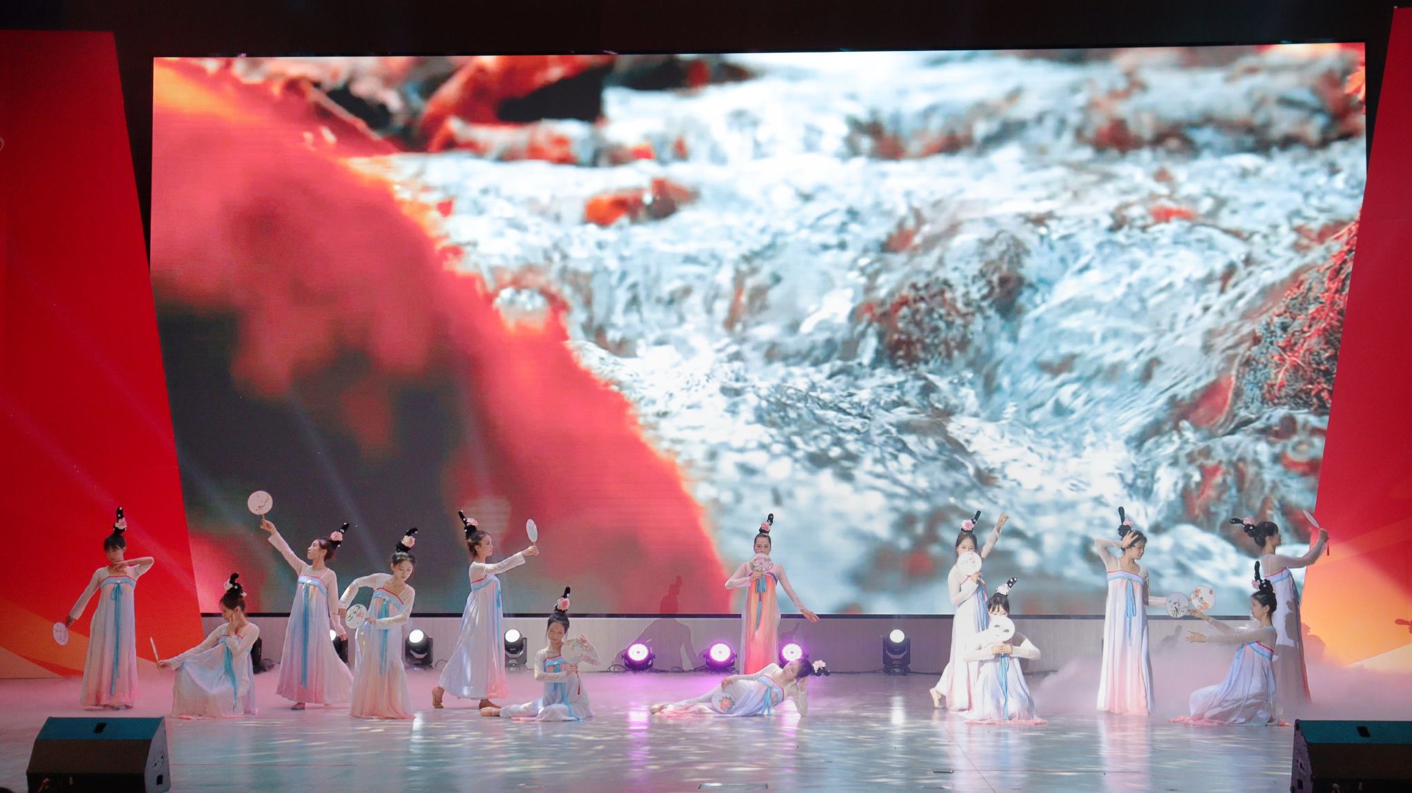 演出进入“梦启今朝”篇章,大学生艺术团舞蹈团带来古典舞《花想容・露华浓》。舞者身着唐制服饰,水袖翻飞,舞姿轻盈优美,通过灵动碎步与舒展托举,演绎出盛唐的雍容华贵,让观众领略大唐繁华。