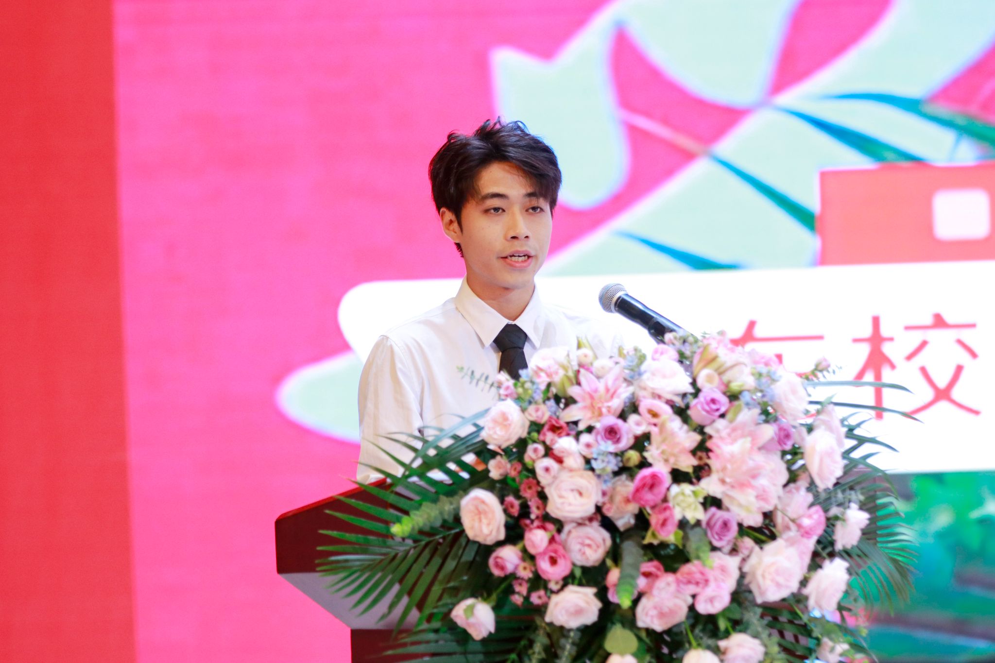 在校生代表、电气与电子工程学院2023级电气工程及其自动化专业曾宇奇同学则代表全体在校生送上真挚祝福。他回忆起师兄师姐们在实验室中的专注探索、在知识海洋里的不懈追求,感慨万千,也以此激励自己继续努力前行。