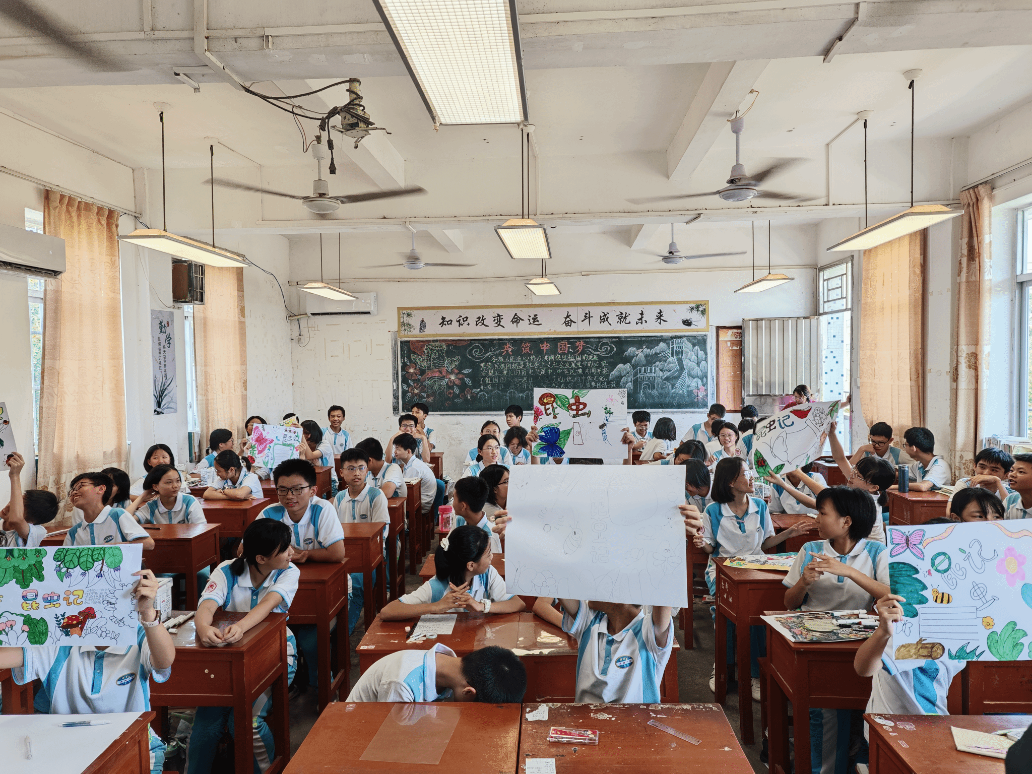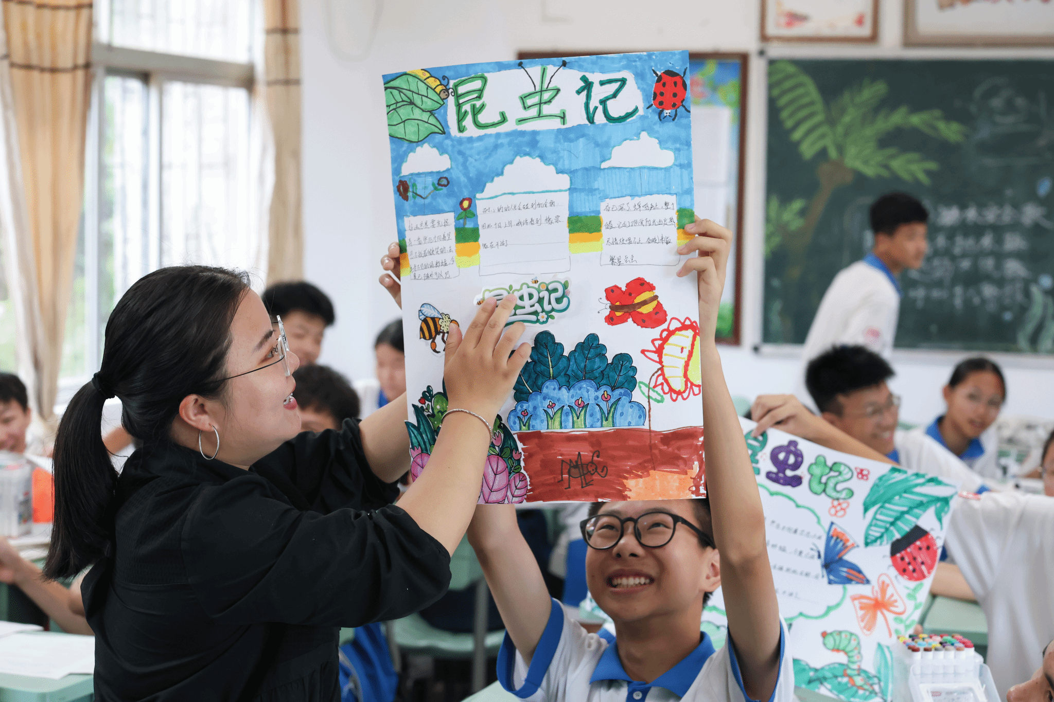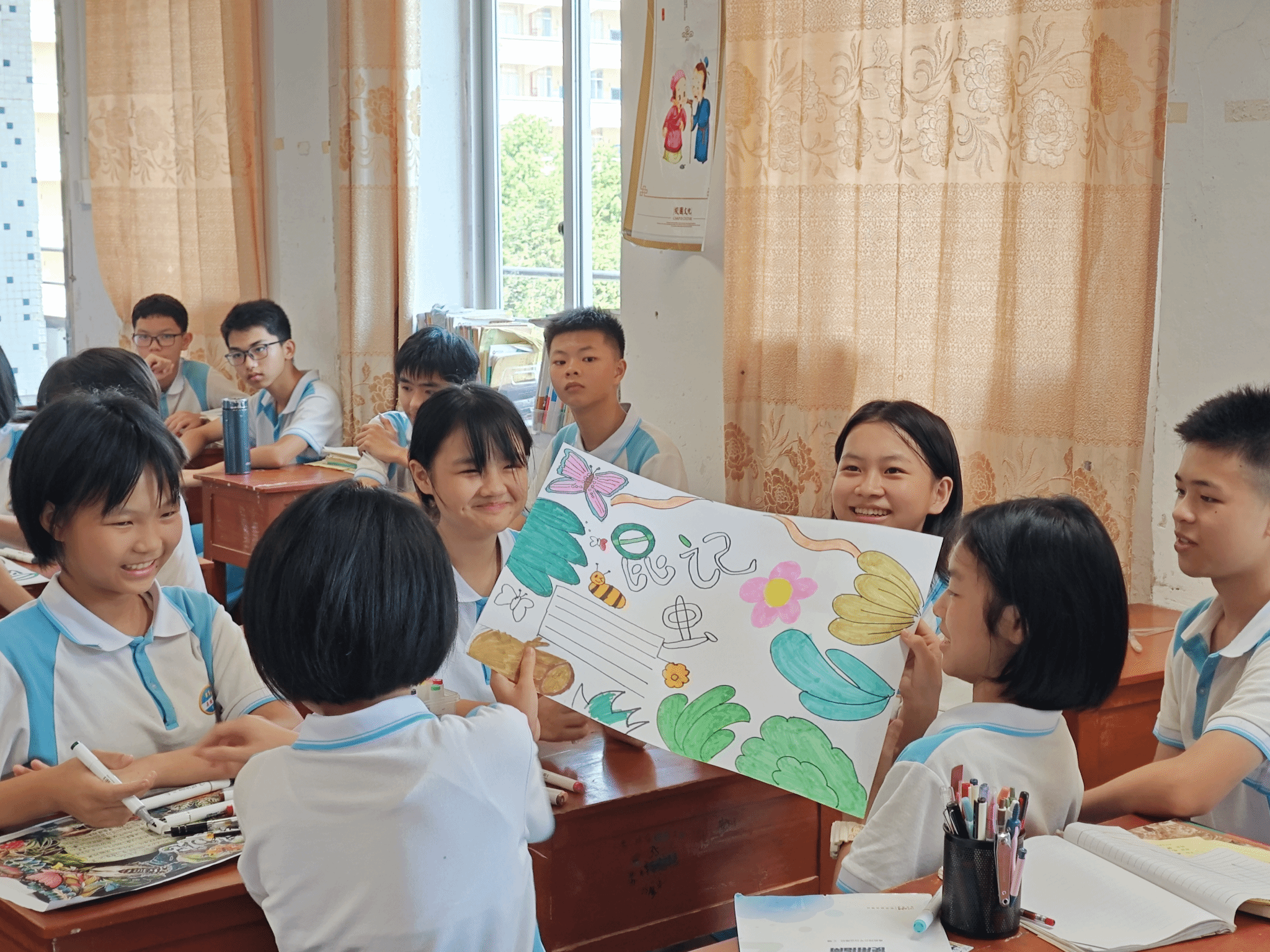 在艺术支教环节,由伟德官网艺术设计学院教师刘婷、文雅、聂艳鑫、李莹、易晶晶、高婷婷组成的支教团队,为5所中小学送上阅读及手抄报创作课程。如:文雅老师以《昆虫记》为切入点,通过互动问答引导学生发现文学与自然的联结;李莹老师则带领学生以“昆虫记”为主题创作手抄报,从版面设计到色彩运用,激发学生对艺术的感知力。课堂上,学生们手持马克笔专注勾勒,认真向支教教师请教,黑板上 “尊师守纪,勤奋求实”标语与学生作品交相辉映,形成充满活力的教学场景。