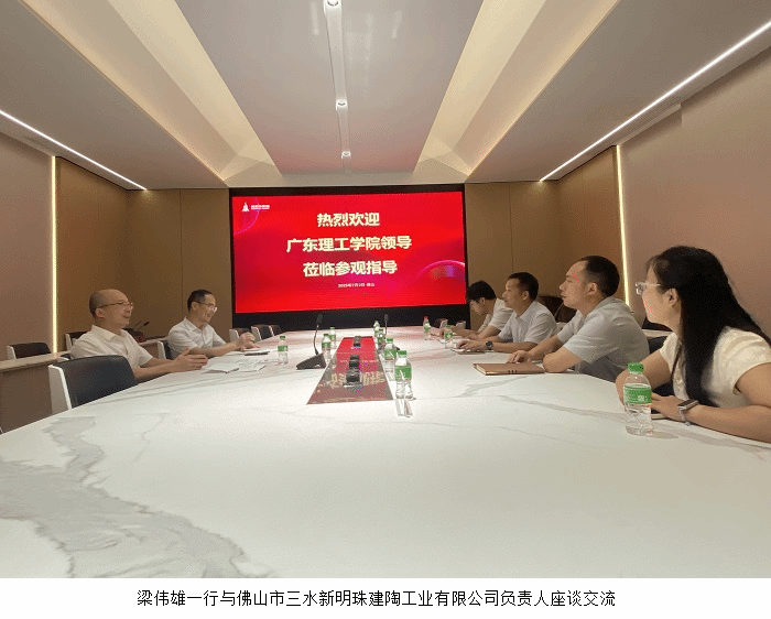 随后,梁伟雄一行赴佛山市三水新明珠建陶工业有限公司走访,参观了园区生产环境,与企业代表就建材行业发展趋势、岗位需求及校企协同育人模式展开深入交流。座谈会上,梁伟雄介绍了学校的办学特色、专业设置及人才培养模式,希望双方在实习就业、技术研发、人才培养等方面深化合作,共同培育适应行业需求的高素质应用型人才。