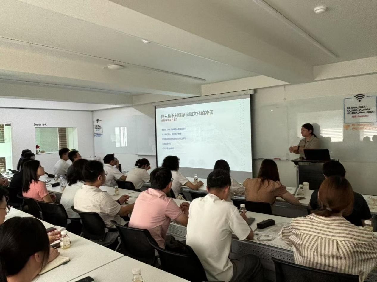 在东国大学,毛东智老师带来了“民主意识对儒家校园文化的冲击”专题分享。她深刻剖析了在韩国社会民主化进程中,强调个体平等、自主表达的民主理念与注重等级秩序、集体和谐的儒家校园传统之间形成的张力——这种冲击既体现在师生关系上,如传统“师道尊严”与学生平等对话诉求的碰撞,也反映在校园管理中,如集体决策模式与个体权利主张的博弈,更渗透在教育目标里,如统一价值观塑造与多元个性发展的平衡;毛东智老师指出,这种冲击并非对立,而是文化转型中的调适,关键在于找到融合路径,例如在保留儒家尊师重道、协作互助等核心价值的同时,吸纳民主意识中的理性沟通、参与式管理等理念,构建既具文化根基又富现代活力的校园生态。随后,教师们积极地提问和表达了自身的想法。通过交流,教师们表示回到学校后将在校园治理中兼顾课堂规范与师生的民主参与,进而在传承中华优秀传统文化的基础上,培养学生的现代公民素养与批判性思维,让校园文化在传统与现代的交融中更适配新时代人才培养的需求。