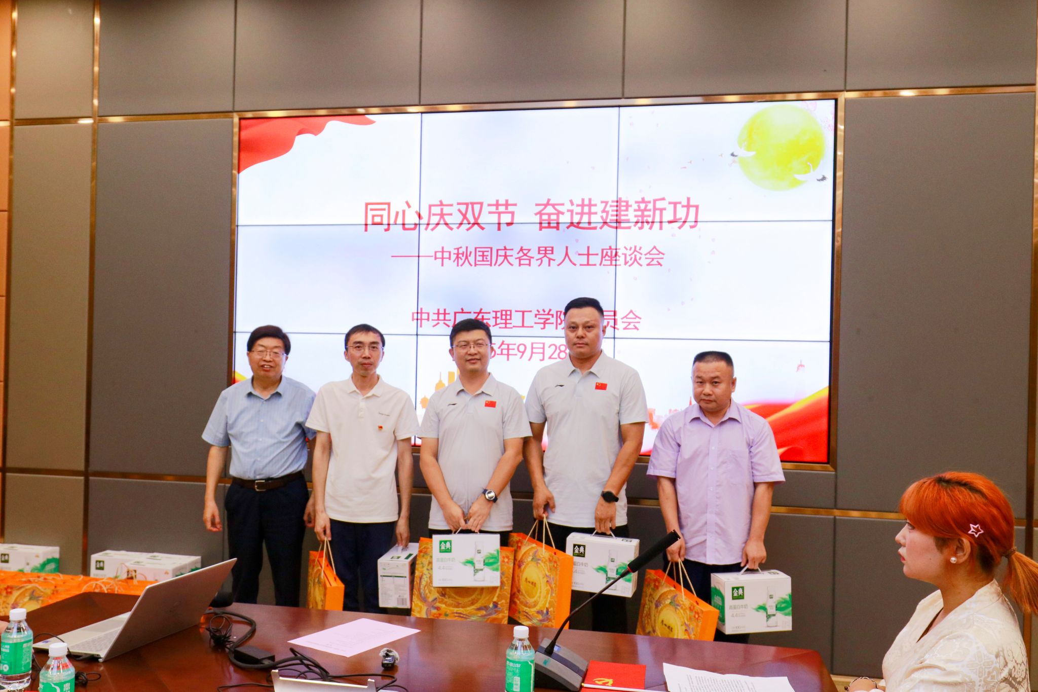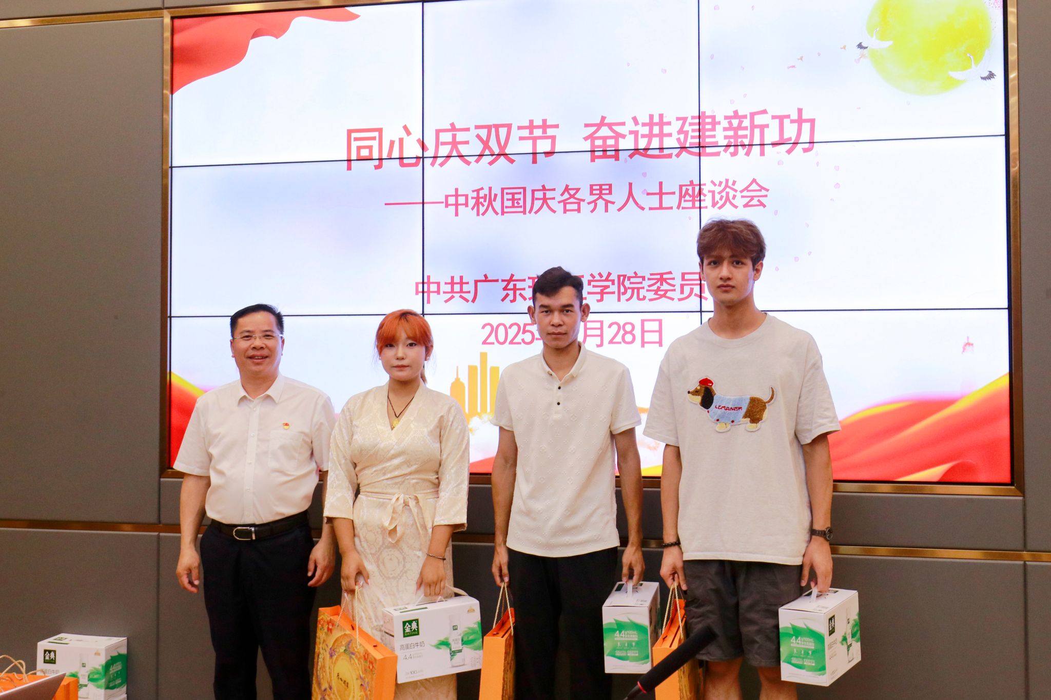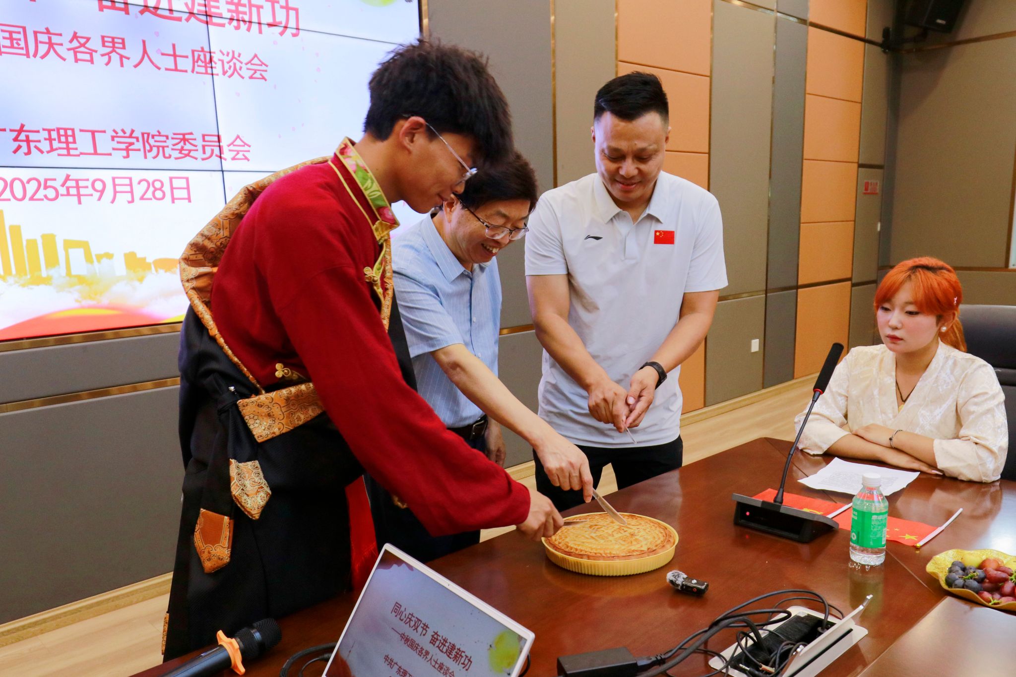 学校领导与参会代表共享月饼,并为参会代表送上节日礼品,传递组织关怀与温暖。座谈交流环节,民主党派代表罗源凯、张智明教授等围绕学科建设、师资培养等方面建言献策,学生代表索珍等表态将积极践行“强国有我”青春誓言。