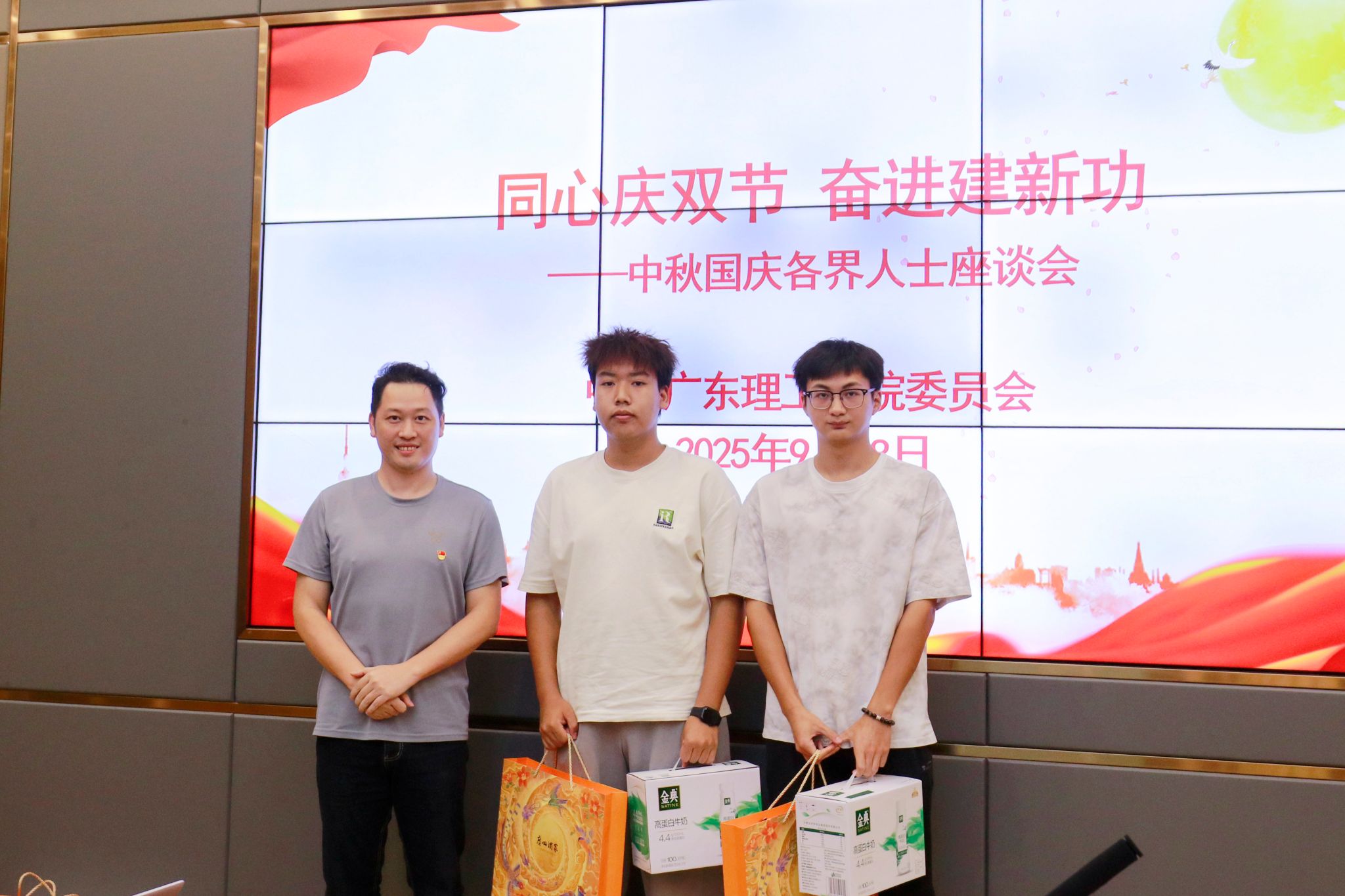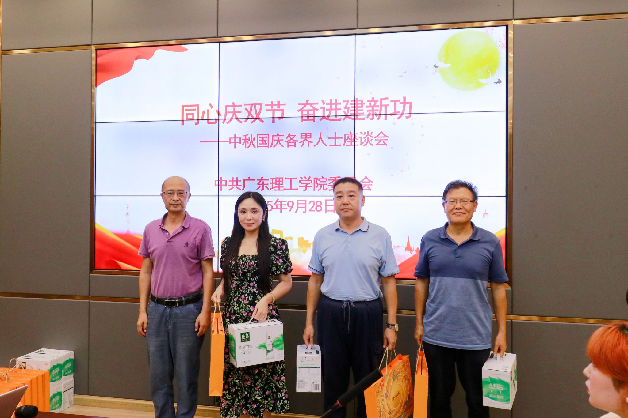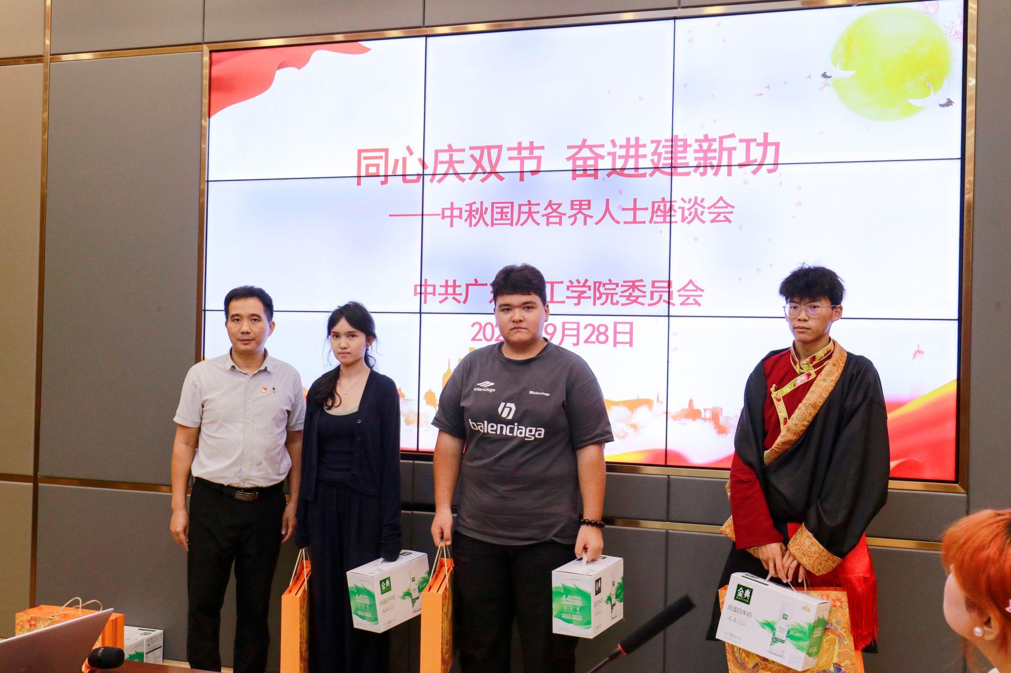 学校领导与参会代表共享月饼,并为参会代表送上节日礼品,传递组织关怀与温暖。座谈交流环节,民主党派代表罗源凯、张智明教授等围绕学科建设、师资培养等方面建言献策,学生代表索珍等表态将积极践行“强国有我”青春誓言。