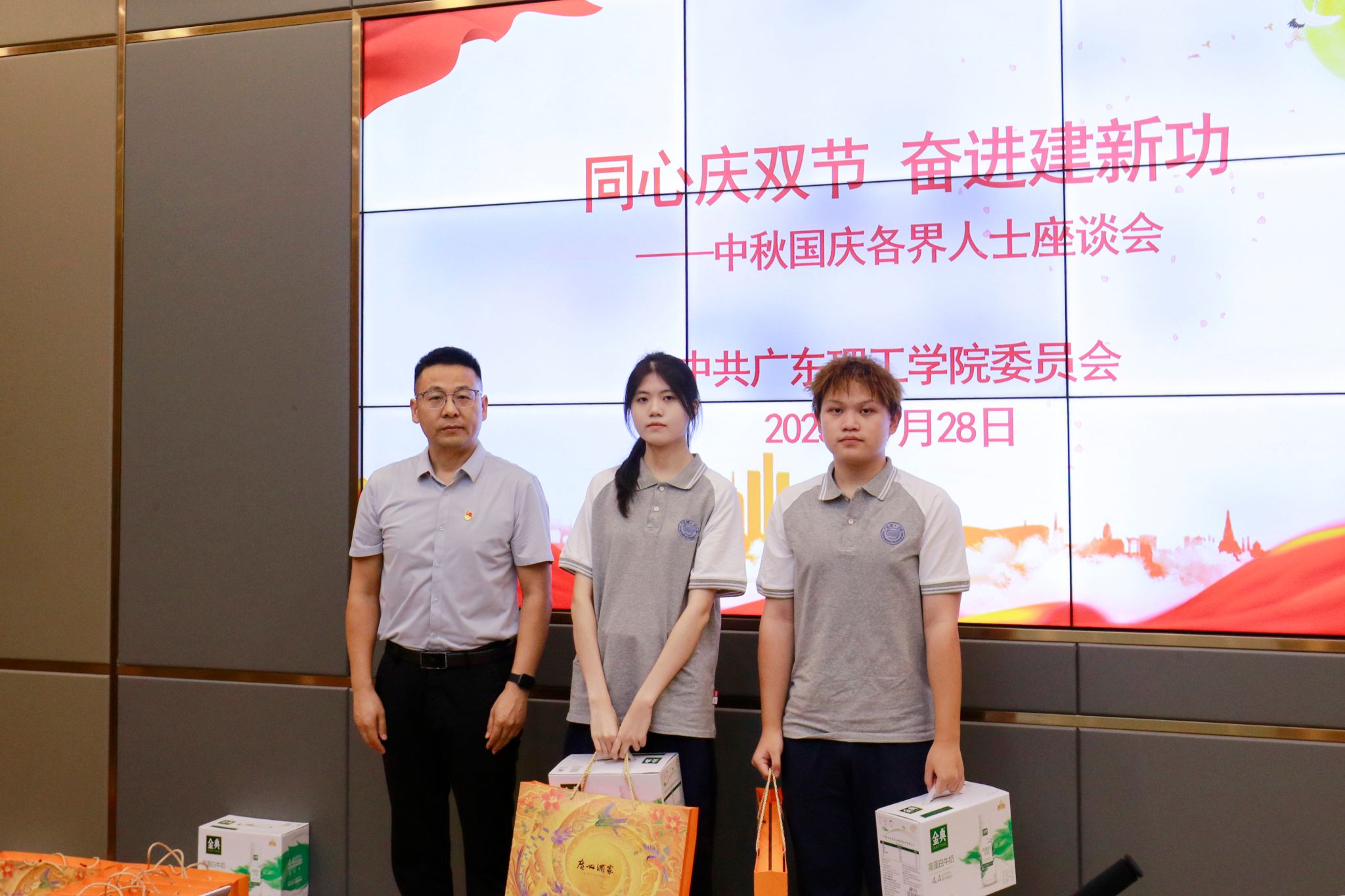 本网讯(组织部)金秋送爽,丹桂飘香。在中秋、国庆双节来临之际,为凝聚统一战线智慧力量,共话学校发展蓝图,9 月 28 日,学校党委于行政楼会议室召开”同心庆双节 奋进建新功“中秋国庆座谈会。校党委书记胡海建出席会议并讲话,党委组织部(统战部)部长黎伯毅主持会议。党委学生工作部部长谢桂袖,教务处处长张俊林、人事处处长黄志华等相关部门负责人,以及侨联主任赵宇宏、民盟主任曾亮及民主党派代表和学生代表共同参会。