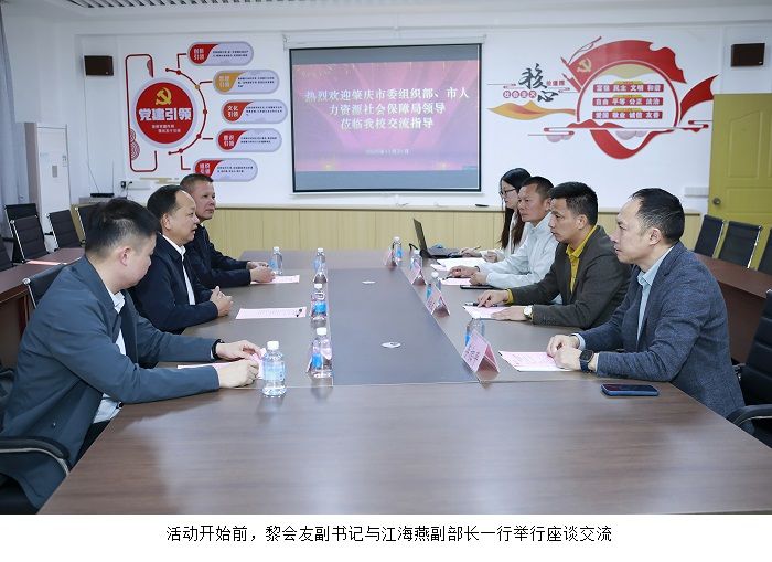 活动开始前座谈环节,黎会友对市委组织部、市人社局领导莅临学校举办“百万英才汇南粤 ”就业指导推介活动表示热烈欢迎,表示希望强化校地合作,推动更多毕业生留肇发展。江海燕对学校承办本次活动的大力支持表示感谢,并介绍了活动筹备相关情况。
