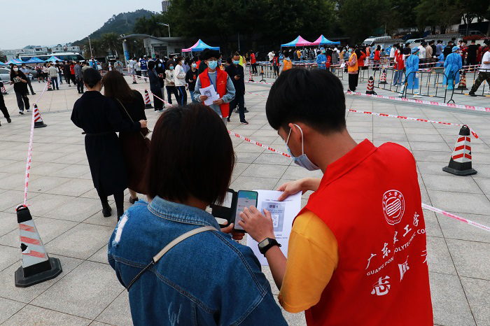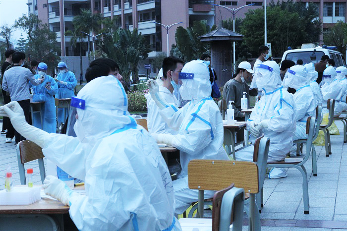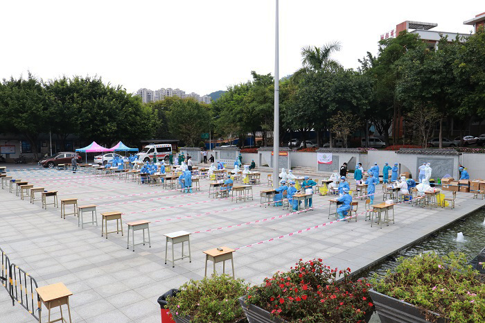 医校互助,齐心合力,为校园安全保驾护航。高要校区大规模核酸筛查工作进展顺利。本次的大规模核酸筛查,由高要区卫健局统一安排160名医护人员进驻校园采样,现场高效有序,各项工作衔接顺畅。师生志愿者近300人次,安保人员及后勤保障近150人次。