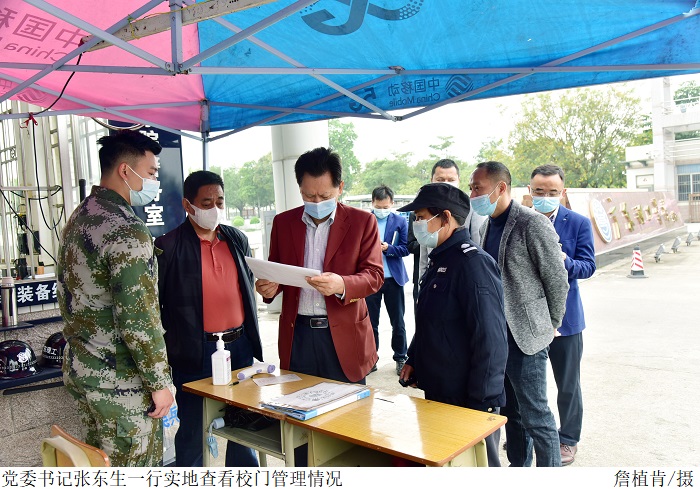 在学校校门,张东生一行实地查看管理情况,与值守人员现场交流,调研学校疫情防控各项措施落实情况,并详细了解出入人员检测和信息登记等情况,要求值守人员切实做好出入人员和来往车辆管控,严守校园疫情防控第一道安全防线。