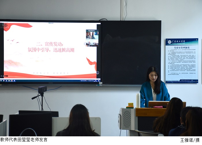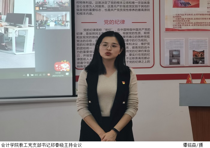 会议开始,田莹莹同志分享学习心得,她谈到会计学院以示范带头、宣传发动、课堂互动、考试驱动、积极行动五动协力推进党的十九届六中全会精神。