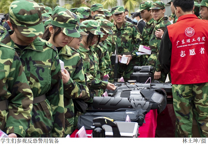 活动现场,师生观看反恐怖宣传教育动漫视频、市公安局高要分局警务实战教官组实施的反恐技能和反恐演练。教官通过现场动作分析与解说,让听讲师生更直观地了解处置细节,指导师生在实际生活中遇到突发事件应如何正确采取相关措施。