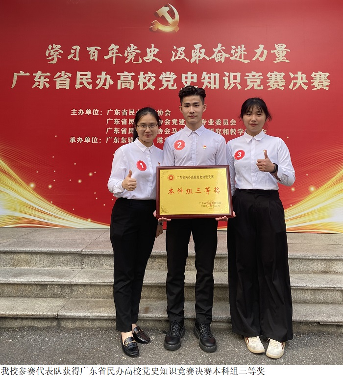 为充分展示我省民办高校党史学习教育的阶段性成果,进一步激发广大师生持续参加党史学习教育的热情,广东省民办教育协会举办了广东省民办高校党史知识竞赛,竞赛分为学习、预赛、复赛和决赛四个阶段,采用限时网上答题和现场答题相结合的方式进行。经复赛,全省民办高校共8支本科代表队伍入围决赛。伟德官网代表队由领队黎钻仪老师,智能制造学院林婉仪同学和经济管理学院梁稳泰同学组成。他们在备战党史知识竞赛中认真学习、学深悟透,在决赛中沉着应战、团结协作,最终载誉而归。