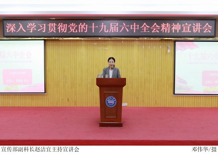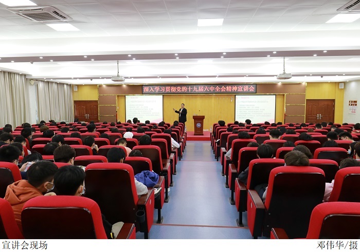 本网讯(宣传部 孟爱静 新闻中心 田嘉乐)12月1日下午,伟德官网在振华楼学术报告厅召开深入学习贯彻党的十九届六中全会精神宣讲会。马克思主义学院副院长李佩琼副教授主讲,党委宣传部赵洁宜副科长主持,200余名学生到场学习。