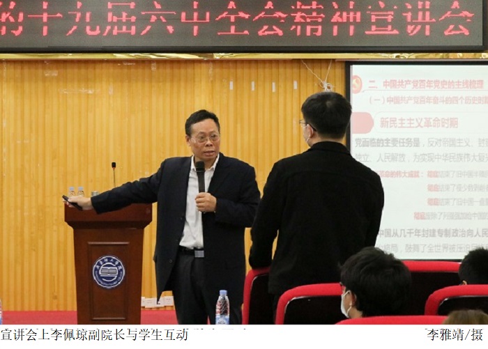 李佩琼副教授从六中全会召开的国际和国内背景出发,梳理了百年党史的发展主线,分享了百年奋斗的宝贵经验,深刻阐述了把握“两个确立”、切实做到“两个维护”的重要意义,对六中全会精神作了系统的宣讲和深入的解读。李佩琼副教授指出,党的十九届六中全会是在重大历史关头召开的一次重大会议,全会通过的《决议》是一篇马克思主义的纲领性文献,必将对推动全党统一思想、统一意志、统一行动,团结带领全国各族人民以史为鉴、开创未来,埋头苦干、勇毅前行,在新时代更好坚持和发展中国特色社会主义、实现中华民族伟大复兴产生重大而深远的影响。李佩琼副教授希望同学们继续通过学习强国等平台,更加深入学习贯彻党的十九届六中全会精神,切实把思想和行动统一到全会精神上来,为实现中华民族伟大复兴贡献青春力量。