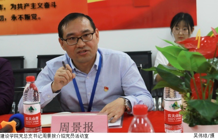 周景报在交流会中分享建设学院党员活动室的整改工作经验。他分享到,针对活动室存在的问题,整改小组各部门分工合作,分配任务,请教相关专业教师,并对党史学习教育有关墙报的图片、文字反复讨论、检查、核对,寻找专业的设计公司定做。