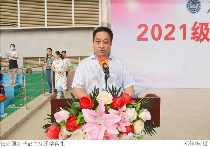 本网讯(校报记者 张鹿鸣/钟思莹) 金秋九月,丹桂飘香,又是一年开学时。9月13日上午,高要校区2021级新生开学典礼在田径运动场隆重举行,大会由党委副书记张宗珊主持,校长张湘伟、副校长谭锦兴、校长助理唐建宁以及各院系领导出席,新生辅导员和2021级新生参加。