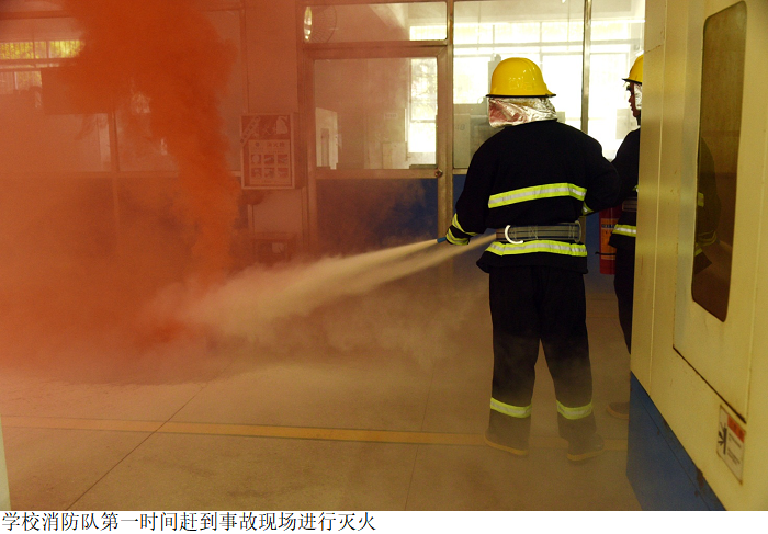 16:30许,演练正式开始,在第9号楼一楼机械制造生产性实践基地内的学生突然发现实验室内浓烟弥漫,实验室老师立刻拨打报警电话,拉响消防警报,同时指挥实验室内所有人员马上停止实验并撤离现场,参演师生捂住口鼻弯腰低头跑向较近的安全出口,沿逃生通道有序疏散撤离到空地,疏散过程有条不紊。学校消防队第一时间赶到事故现场进行灭火,但因火势太大失败。消防官兵接到报警后迅速出警赶到现场开展救援工作,经过消防官兵和现场救援力量的一起努力,火势很快得到控制。同时,救援人员将模拟伤员抬上担架,运送到安全位置进行救治。