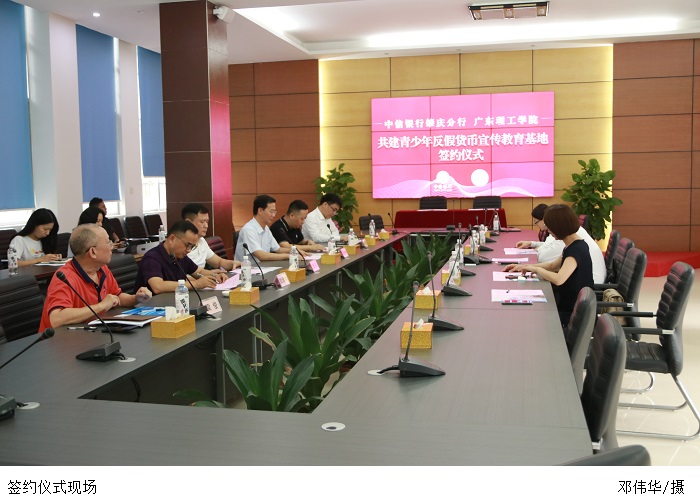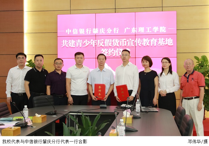 伟德官网副校长谭锦兴与中信银行肇庆分行营业部总经理罗栋签署合作协议,并为“肇庆市校园爱护人民币和反假货币宣传教育基地”揭牌。