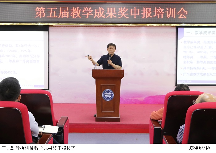于兆勤教授就如何申报教学成果进行了生动、详实的介绍。于教授指出,教学成果的凝练,要立足于现阶段高等教育改革现状,致力于解决高等教育中的热点问题,并列举了当下备受关注的几个热点问题。于教授还就支撑材料的准备、申报书的填写,通过日常生活的案例,深入浅出进行分析讲解,让老师们在轻松的氛围中学习到了日常积累和严谨填写申报书的重要性。