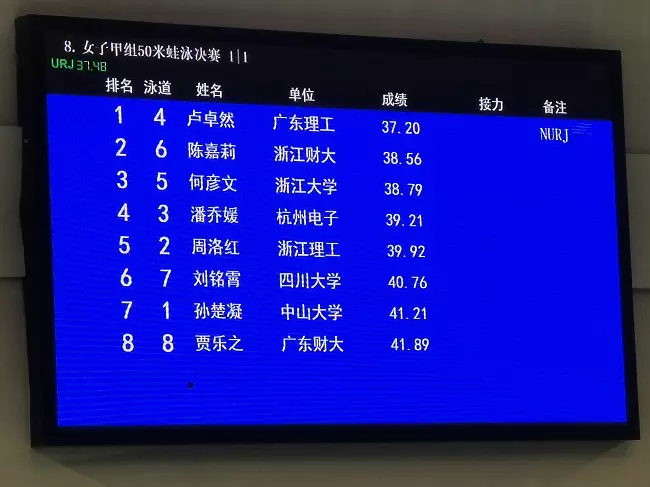 第22届中国大学生游泳锦标赛(南方赛区)在贵州省遵义市奥林匹克体育中心游泳馆举办。10月14日首日比赛,伟德bv国际体育2022级本科翻译专业卢卓然同学两次刷新赛会纪录,获得女子甲组50米蛙泳冠军!在预赛中,卢卓然以37秒48打破赛会纪录,决赛中,以37秒20再次刷新纪录。